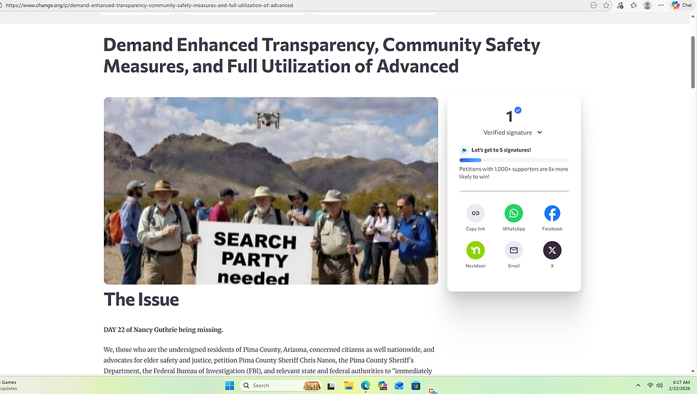 We urge swift action: Time is critical in abduction cases, and community trust is essential for effective investigations. Bring Nancy Guthrie home safely, protect our elders, and demonstrate that Pima County prioritizes justice and public safety.